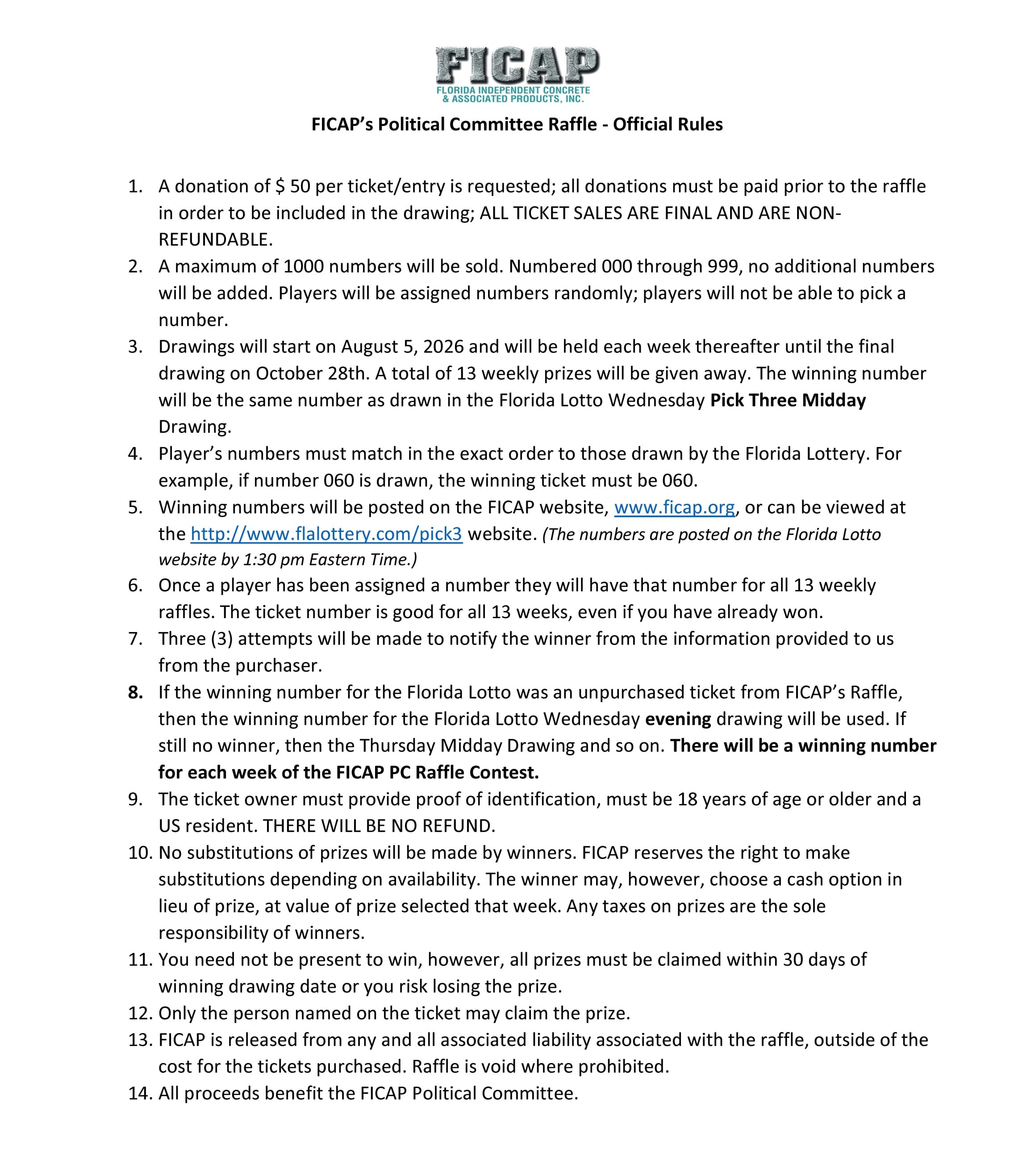 Special Registration used for the purchase of the PC Raffle Tickets. Drawing Midday Wednesday August 5, 2026 through October 28, 2026. Florida Lotto Pick 3 numbers will be utilized as the winners and are posted on the FICAP website and the Florida Lotto website after 1:30 pm Eastern time. Posted rules apply. Guaranteed Winner each week. Raffle Tickets valid for all 13 weeks of drawings. May win multiple times with each ticket purchased.Images
